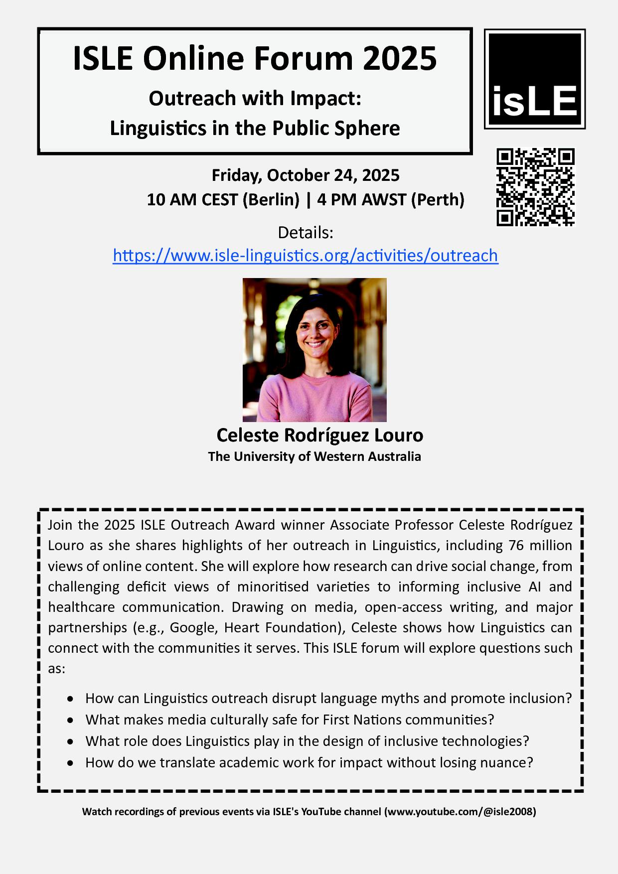 The next ISLE Online Forum will take place on 24 October 2025, 10:00am (CEST): Celeste Rodríguez Louro - "Outreach with Impact: Linguistics in the Public Sphere" (Zoom link).